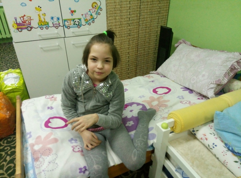 В Дом Милосердия фонда "Русская Берёза" приехала сирота Юлечка по направлению от другого фонда. Ей 9 лет, девочка из Азовского дома - интерната для умственно отсталых детишек. У неё врожденная правосторонняя косолапость, укорочение правой ножки, ДЦП, эпилепсия. В общем, несчастный ребёнок. Ножку её будут выправлять операцией, оденут ортопедические приспособления и, Бог даст, Юлечка будет нормально ходить.