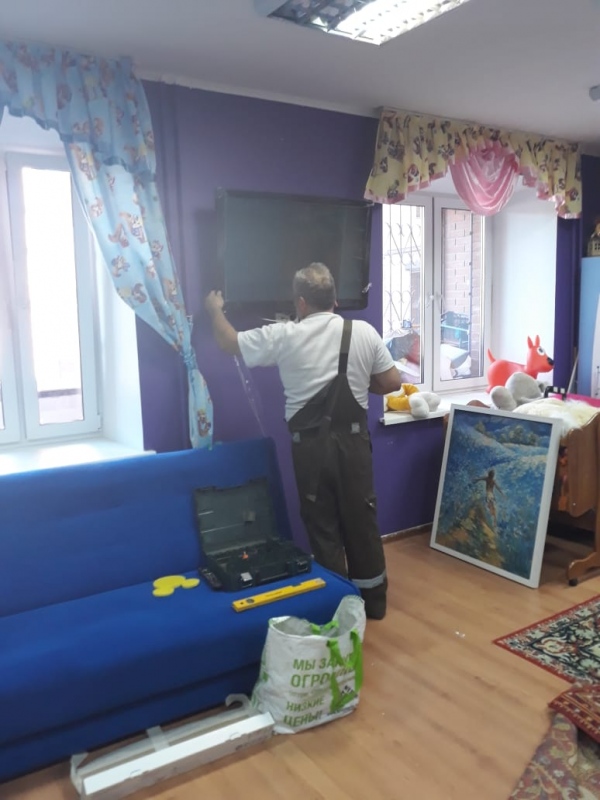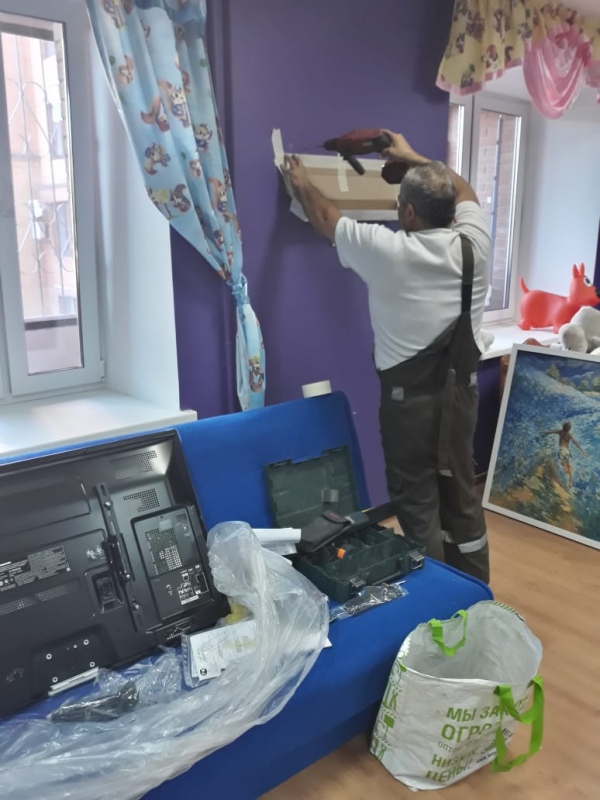 Недавно в Доме Милосердия фонда "Русская Берёза" был благотворитель Олег. Он увидел, что телевизор стоит на тумбе и дети все время хватают его руками, нажимают на кнопки, сбивают настройки. Телевизор очень большой, нам его подарили, дети смотрям мультики. Но всем же хочется потрогать экран. Тогда Олег прислал специалиста, который сделал специальное устройство, чтобы телевизор повесить на стену. Мы очень благодарны Олегу, потому что дети теперь не дотянутся и места стало в зале намного больше. Спасибо!!!!!