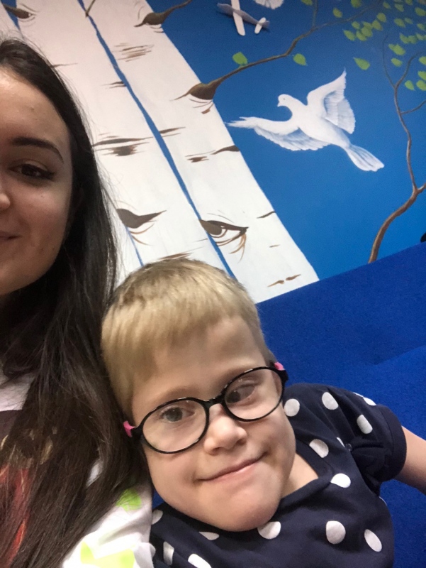 На фото: Танечка и наш волонтер Сашенька. Танечка приехала на лечение в Москву. Находится в Доме Милосердия.