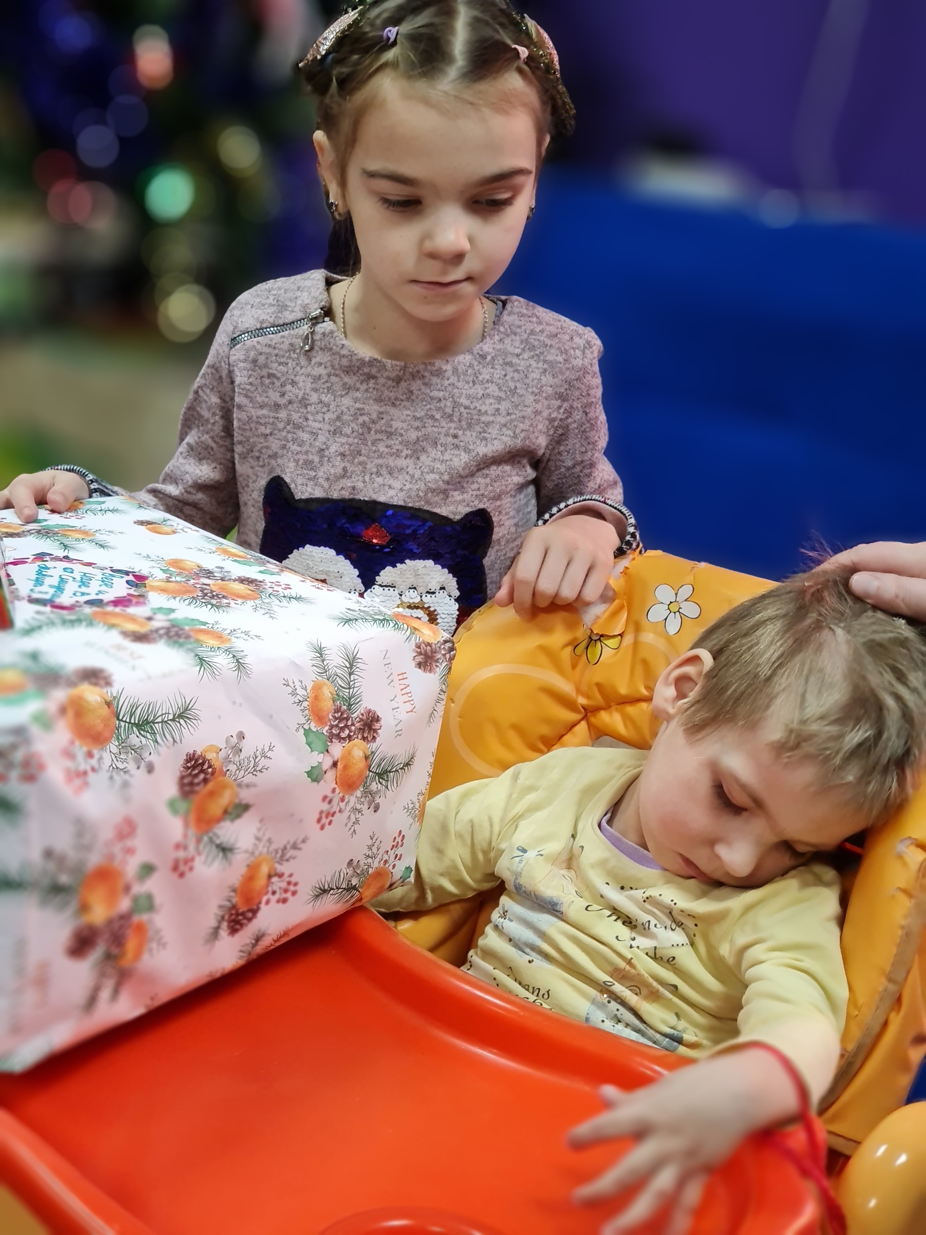 Верочка. Она должна была приехать в Дом Милосердия с сестрой двойняшкой - Наденькой. Но перед самым отъездом сестрёнка заболела. Мама Ира уже была несколько раз в нашем Доме Милосердия с обеими девочками. Они приезжали из Смоленской Области в московскую клинику. Сейчас нужно было вновь показаться врачам и Вере и Наде. Из-за болезни Нади, Вера приехала одна... Маленький волонтер Дусенька передала подарки от Снегурочки обоим сестричкам. И даже маме Ире. Дусеньке было очень трудно, потому что она очень жалела девочку. Маленькую и совсем не улыбающуюся. Только красивый музыкальный зайка заставил Верочку поднять головку, которую так тяжело держать. Второй зайка поехал к Наденьке. В Новый Год мы желаем девочкам найти такое лечение, которое облегчит их мучения. А родителям здоровья, терпения и помощи добрых людей. Снегурочке огромное спасибо за подарки!!!