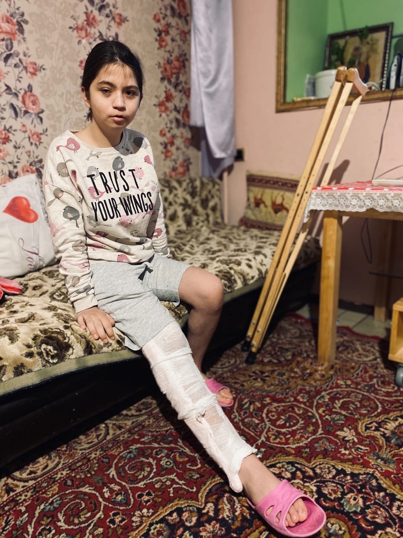 Летом Рената уже могла активно кататься на самокате, роликах. Врачи говорили, что Рената идет на поправку и все будет хорошо. Но у Ренаты опять произошла травма, колено очень сильно вывернулось. Чтобы зафиксировать коленный сустав и уменьшить на него нагрузку, Ренате наложили гипс.