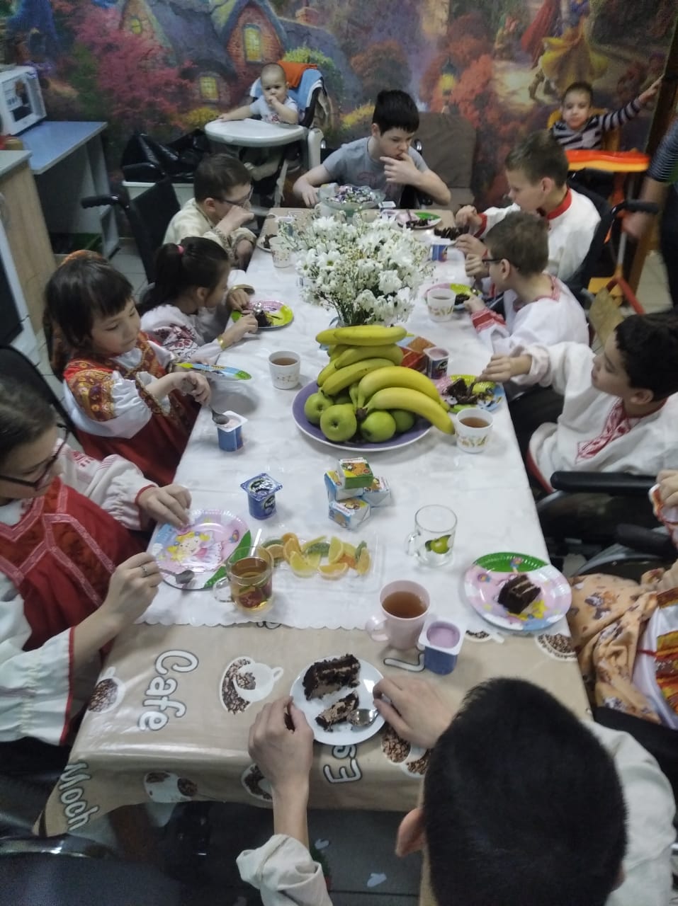 Дети нарядились в самые красивые костюмы, девочки надели русско-народные сарафаны. За большим обеденным столом на кухне Ольга, Александр и все жители Дома Милосердия пили чай, кушали блины и сладости.