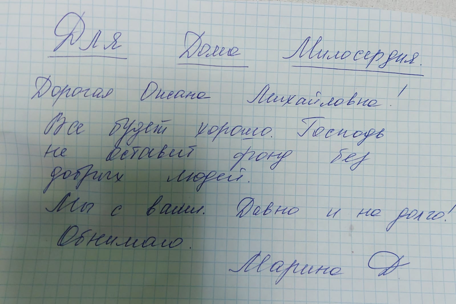 Мариночка Д. прислала в Дом Милосердия посылочку с продуктами. В посылочке была записочка: "Дорогая ОксанаМихайловна! Всё будет хорошо. Господь неоставит фонд без добрых людей. Мы с вами давно и надолго! Ваша Марина Д." Это самые лучшие слова! Спасибо, дорогая Мариночка, от всех нас! Низкий Вам поклон!!!!!!