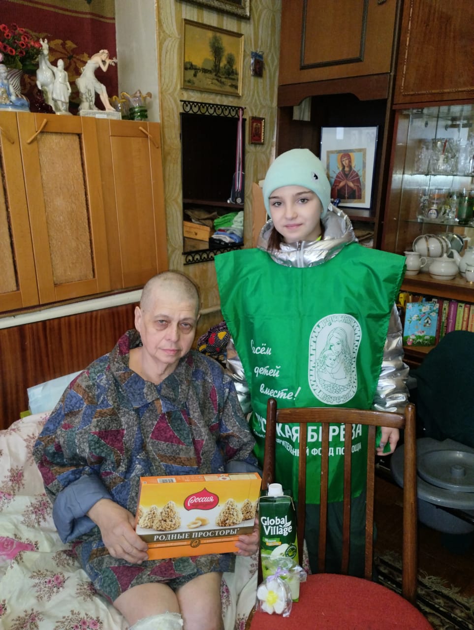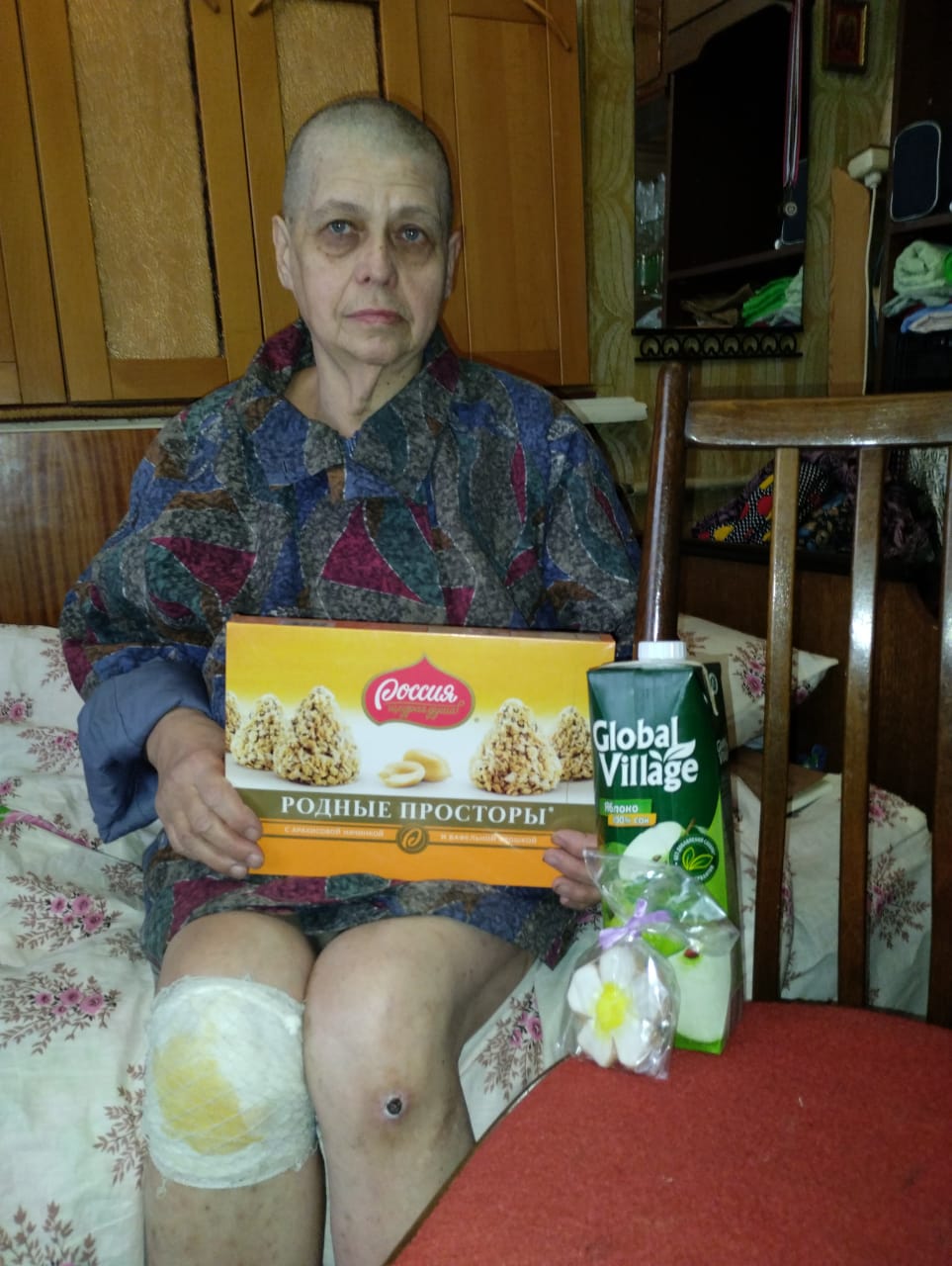 Это наша трапезница, как вы помните. После инсульта. Чувствует себя немножечко получше. Но ещё очень слаба. Так была рада, что мы приехали и привезли продукты. Говорит: "Приезжайте ко мне на юбилей, ничего не нужно, просто повидаться". Мы, конечно, съездим, это будет через недельку.