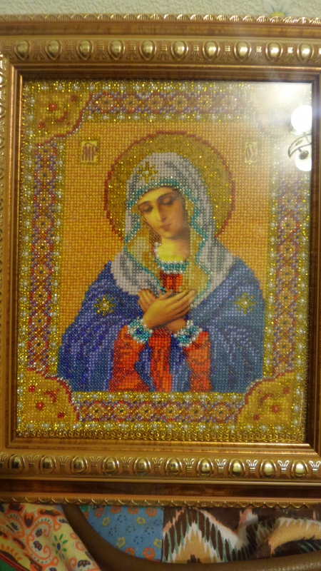 Хоть и с небольшим опозданием, но просто не могу не отметить подарок моей подопечной деточки Марины. На день рождения она сама для меня вышила икону Божией Матери, именуемой "Умиление". Она и не знала, что именно эта икона одна из моих любимых, потому что я очень почитаю св прп Серафима Саровского. Марина такой благодарный ребёнок. Можно же было просто подарить что-то купленное. Но она так не стала делать, а трудилась кропотливо, несмотря на свои больные глазки, долгое время. В итоге получилась такая душевная красота! Спасибо моя дорогая новая доча! Разве может быть что-то дороже....