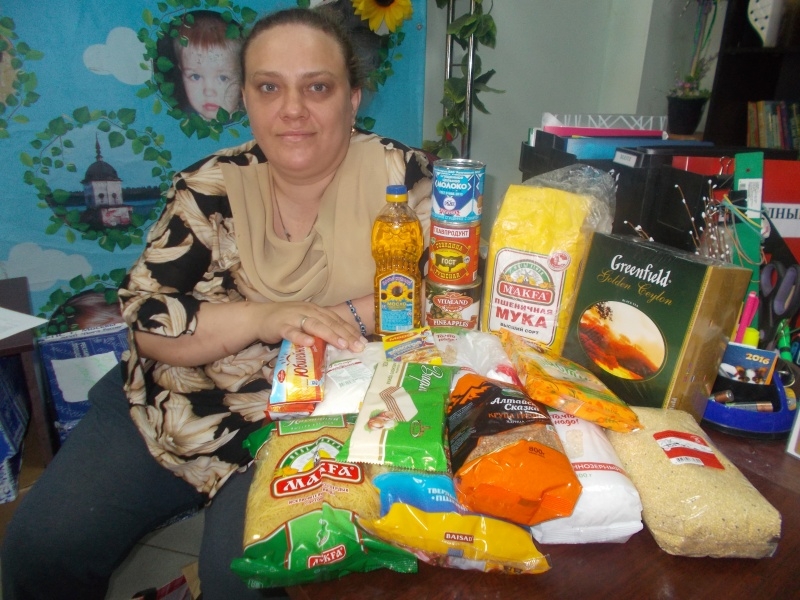 Передано: продукты - детское фруктовое пюре, подсолнечное масло, рис, пшено, макаронные изделия, манная крупа, геркулес, яйца, курица, молоко, средства личной гигиены - шампушь, зубная паста, зубные щетки, мыло, туалетная бумага, женские и детские вещи.