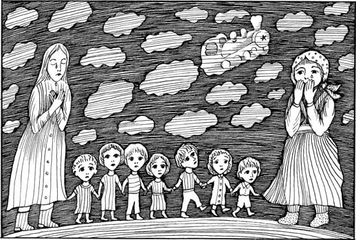 враждой. Мы звали детдомовцев бандой зеленых. А звали потому, что их лечили не как нас, не йодом, а зелёнкой. Тогда я ее впервые увидел. Детдомовцы были лихие ребята, все перецарапанные, поэтому все перемазанные зеленкой. Но наступили школьные годы, детдомовцы были включены в число обычных школьников, и у них, и у нас появились новые друзья. Только мы не могли понять, зачем надо воровать картошку для костра, если мы ее и так принесем. Другое дело - воровать старые аккумуляторы в МТС, чтобы свинец из них переливать на битки, это и мы делали. Все наши игры были военными: с разведчиками, пленными, землянками, штабами, трофеями. Спасибо нашим тогдашним учителям военного дела и физкультуры: они наши стихийные сражения превращали в увлекательные состязания по скорости разжигания костра, переправе через реку и чтоб сохранить сухими спички, по ориентированию в лесу по компасу, а зимой - по бесстрашному катанию с крутых гор и прыжкам через трамплин. Так и говорили: через трамплин, а не с трамплина. Эти трамплины можно было и объехать, испугавшись в последний момент. Еще бы не испугаться: на нем так подбрасывало, что земля, покрытая снегом, долго летела под тобой где-то внизу. Тут уж мы давали фору ленинградцам. Детдомовцы стали бывать и в наших домах, а мы ходили к ним. Помню случай, когда один мальчик стал настолько своим в многодетной семье, что его уже не отличали от своих и он стал называть мамой маму своего друга. Также помню, как инспектор РОНО взяла на воспитание троих мальчиков. Они выросли у нее, одинокой, не имевшей своих детей. А тот первый мальчик рос и рос в многодетной семье, и ему уже было лет четырнадцать, когда его разыскала настоящая мать. Она приехала вся такая нарядная, с подарками. И он, ее сын, сказал ей: - Я понимаю, что вы моя мама, но я от своей мамы никуда не уеду. Эта женщина пожила у них несколько дней, пыталась помогать по хозяйству, ходила с сыном пастушить корову и теленка, потом уехала. От нее потом часто приходили посылки. Им, многодетным, это очень помогало. Уже нет того детского дома, только стоит на этом месте памятный знак, и еще иногда приезжают в село бывшие детдомовцы, седые мужчины и женщины, приезжают на свою вятскую родину. ----------------------------------------------------------- Художник Александр Кривошеев