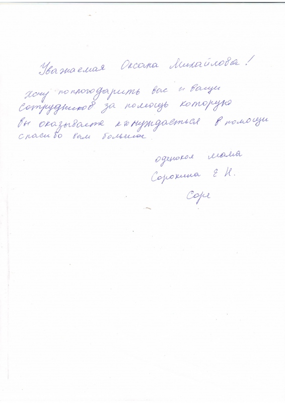 Хочу поблагодарить Вас и Ваших сотрудников за помощь, которую Вы оказываете тем кто нуждается в помощи. Спасибо Вам большое.