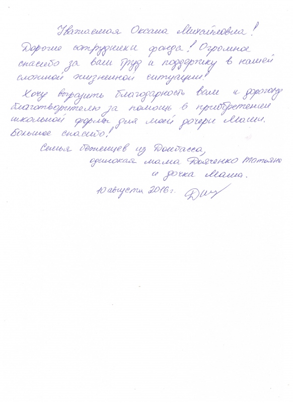 Хочу выразить благодарность Вам и дорогому благотворителю за помощь в приобретении школьной формы для мой дочери Маши. Большое спасибо!