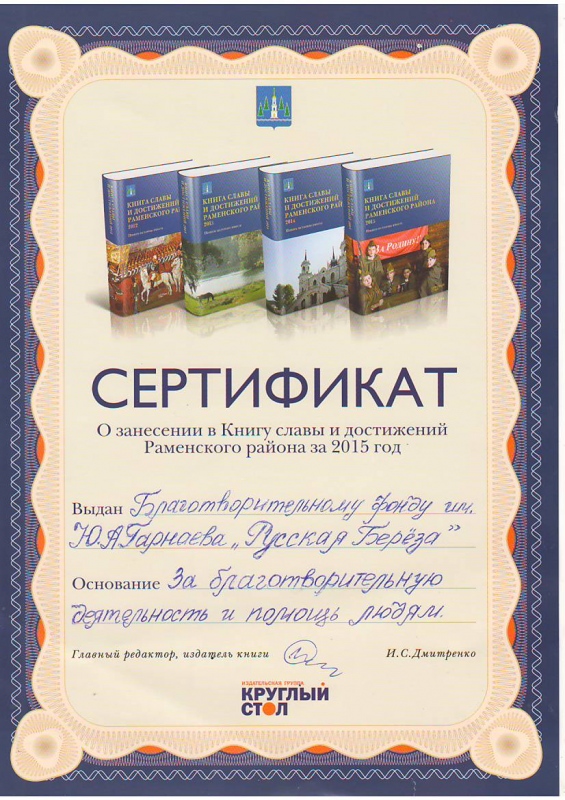 Очень приятно и почетно оказаться на страницах такой замечательной книги. Спасибо издателям!!! В Раменском районе Московской Области у фонда "Русская Берёза" огромное количество подопечных: многие люди и организации, находящиеся в трудной жизненной ситуации получают помощь (особенно в рамках проекта "Счастливые дети Подмосковья"). Плодотворную работу в целях профилактики социального сиротства фонд проводит с Управлением органов опеки и попечительства. Мы очень рады, что Раменский район отметил деятельность фонда!
