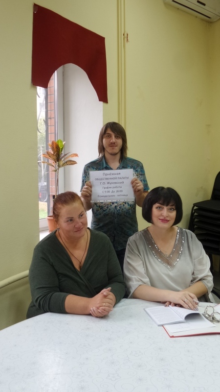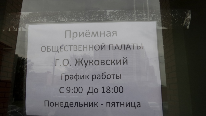 Жители города Жуковский теперь могут обратиться в Общественную Палату ежедневно с 9-18 часов, кроме субботы и воскресенья. Прием проводят Оксана Гарнаева - Председатель Комиссии по благотворительности, по поддержке семьи, а так же и/о Председателя Комиссии по здравоохранению, Зоя Еремина и Марина Филатова - эксперты Комиссий. В Приемной находятся бланки заявлений в Общественную Палату, на бланке можно написать заявление в любую Комиссию, а так же Председателю Общественной Палаты. Адрес Приемной: ул. Гагарина, дом 85, офис 20 (вход с улицы 1 этаж стеклянная дверь). Телефон для справок: 84951077344