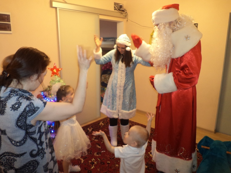 (Дедом Морозом был Игорь, артист со стажем 5 лет в этой роли, Снегурочкой была Юлия — начинающая артистка, а организовала поездку к деткам Любовь)