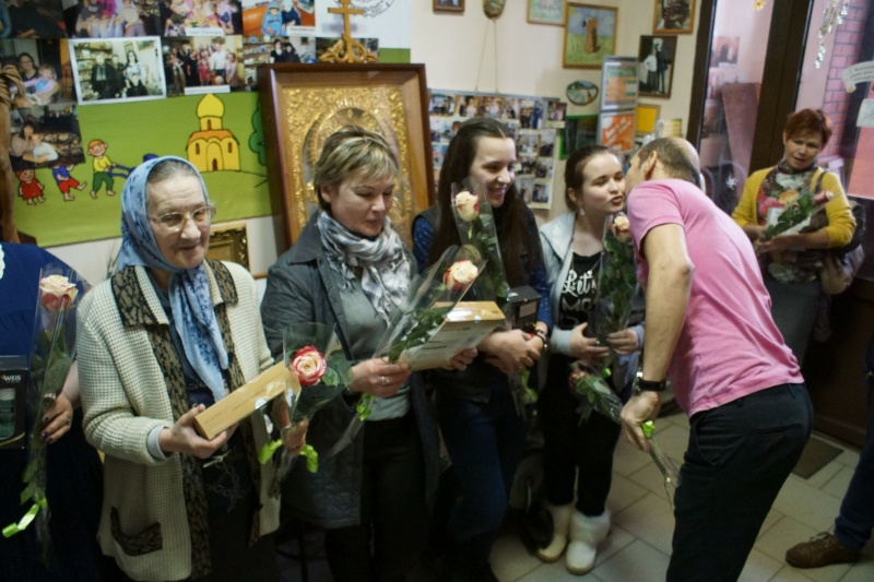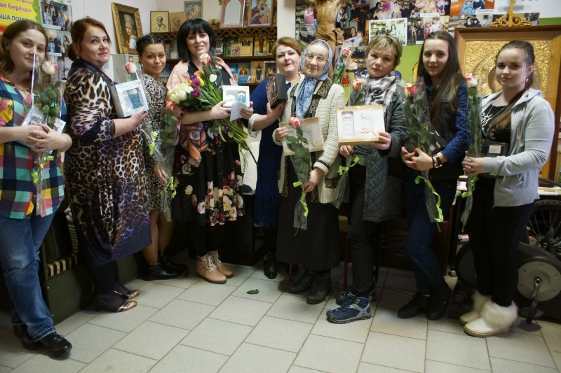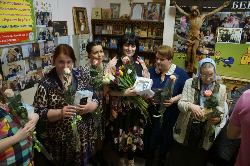 Сотрудники фонда "Русская Берёза" поздравили всех девушек, которые трудятся в фонде с праздником Весны. Мужчины не только подарили цветы, подарки и каравай, но и прочли стихи: