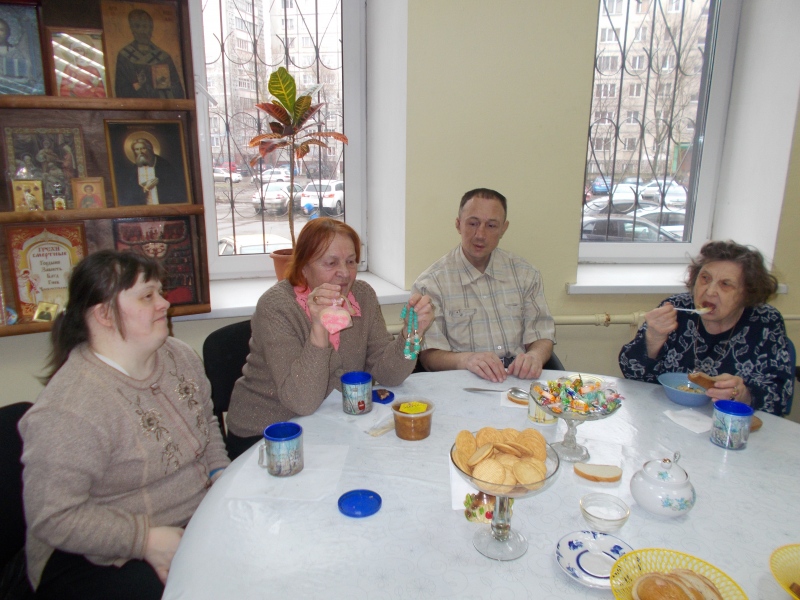 Сотрудники благотворительного фонда "Русская Берёза" поздравили с днем рождения Галину Ивановну Филь, которая со своей дочерью Юленькой посещает благотворительную трапезную. Галине Ивановне исполнился 81 год. Но она на это возраст совсем не выглядит, наверное потому, что отдала все свои лучшие годы Юлечке. А Юлечке, которая кажется ребёнком, уже 45 лет. Галина Ивановна всю жизнь заботится о Юлечке, хоть ей очень трудно. на очень светлый и добрый человек. Пожелав Галине Ивановне здоровья, терпения и многая лета, сотрудники фонда преподнесли ей подарки: мёд "Забрус", бусы, сувенирное мыло и расчёску.