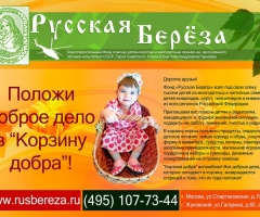 Дорогие наши друзья и благодетели! Если Вы хотите сделать доброе дело и провести акцию "Корзину Добра" у себя в организации, свяжитесь с сотрудниками отдела маркетинга и развития фонда "Русская Берёза"! Телефон 8 (915) 116-42-30, Сергей. Пишите - sg@rusbereza.ru. Дежурный - 8 (495) 107-73-44