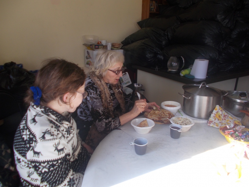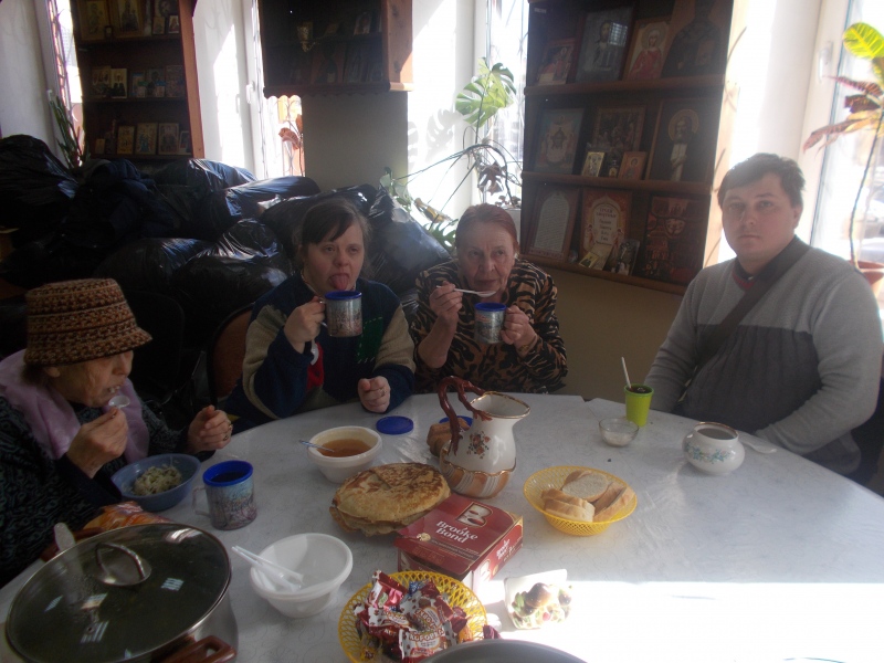 Наши трапезнички (благотворительная трапезная фонда "Русская Берёза") помянули о упокоении Павла по просьбе благотворительницы Татьяны. Покушали, кроме обеда, блинчики с мёдом, киселёк, помолились и разошлись довольные. На фото много чёрных мешков - это сбор гуманитарной помощи для малоимущих Ярославской Области. К сожалению, склад для этого, мы до сих пор не нашли и вот так приходится ютиться. Очень трудно, особенно когда проходит сбор сразу в несколько организаций. Надеемся, что кто-нибудь из добрых людей всё-таки поможет найти недорогой склад, чтоб могла подъехать еврофура. Дорогой мы не можем снять, так как сейчас очень трудное время и аренды нас "душат", трапезная-то работает с трудом. 5000 в неделю нужно на обеды....