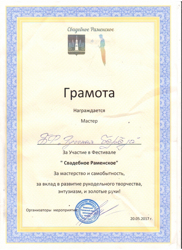 Благотворительный фонд «Русская Берёза» выражает благодарность Семеной Лилие Николаевне (агентство праздников L-клуб") за предоставленную нам возможность участвовать в прекрасном и удивительном фестивале " Свадебное Раменское". Фестиваль проходил 20-21 мая в Парке Культуры и Отдыха города Раменское. Благотворительная ярмарка в помощь Дому Милосердия продемонстрировала ручные работы подопечных фонда, вязаные детские вещички и конечно же самодельные куклы нашей любимой мастерицы Веры Павловны!