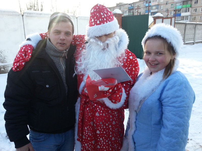 Светка написала деду Морозу, что очень хочет золотые сережки. Оксанка спит и видит телефон «с пальцами» (сенсорный), а Сережка был бы безумно рад золотому колечку «Спаси и Сохрани». Очень добрая тетя Маша привезла колечко для Сергея и серьги для Светланы. Но, после передачи сережек передали еще две пары! То есть хватило на всех девчонок. И еще одна неизвестная Снегурочка подарила Оксанке телефон. Плюс тетя Маша привезла конфеты и еще какой-то дед Мороз привез конфеты. В общем, 30 декабря 2012 года Букаша везла подарки ребятам, Снегурочку, деда Мороза и Фея. Сережка, Светка, Надя и Оксанка ждали с самого утра. Радости их не было предела, когда ребятам вручили подарки!!!! Мечты сбылись! Ребята тоже подарили гостям подарки: плакат с Новым годом, картины и расписные деревянные дощечки. Дед Мороз сказал, что лучшего подарка он и не видал. Расставаться, конечно, не хотелось, но впереди у сказочных героев было еще много добрых дел. Букаша поехала дальше, а ребята еще долго махали от проходной……