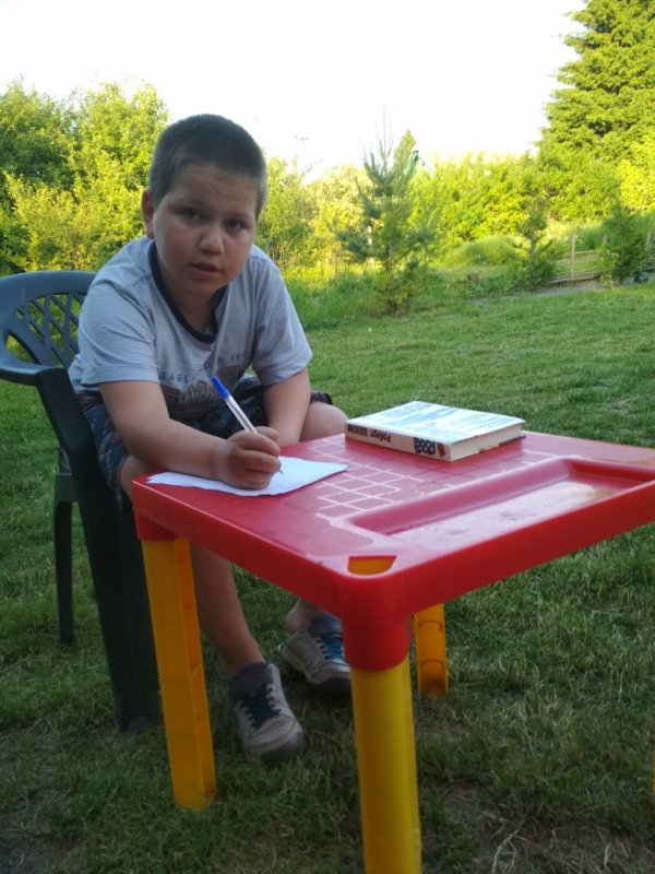 Как хорошо действует на мозги деревня! Наш Ромик, у которого остались "хвосты" по русскому, начал заниматься, на удивление, без проблем. Если дома его достаточно сложно усадить за уроки, то здесь он не только пишет диктанты, но ещё и "преподает" маленькой Мирабелле. Того и глядишь, к осени мы всё и подтянем! Кстати,  не только Ромик преображается в деревне. Наш старый кот Мотя становится совсем молодым. Везде бегает, наводит кошачьи порядки, радуется жизни))))