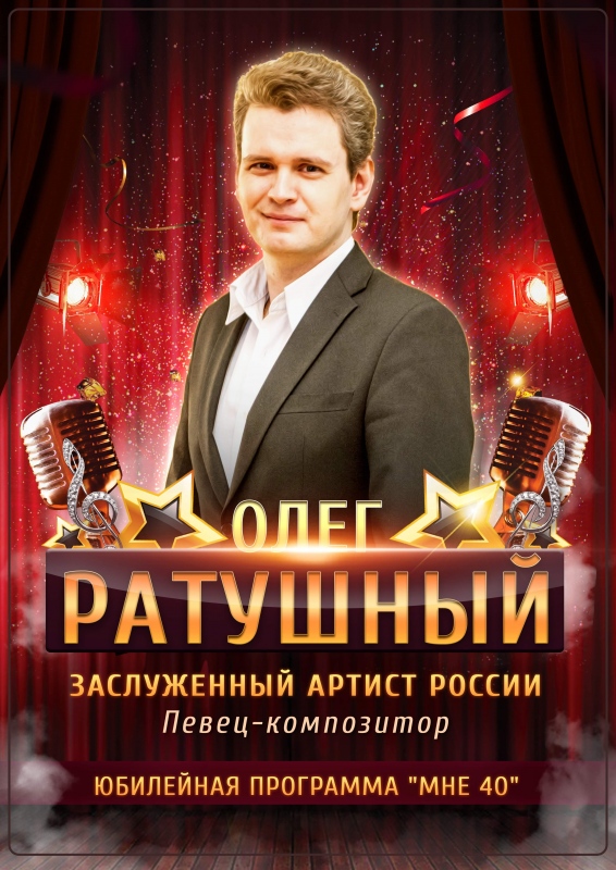 Олег Ратушный - певец-композитор и педагог. Лауреат международных фестивалей и конкурсов. Экс-солист легендарного виа "Надежда", солист группы "Oleg-Company", участник различных телевизионных проектов. В программе концерта Олега Ратушного "Мне 40 лет" примут участие его друзья - артисты Российской эстрады, чтобы помочь Дому Милосердия фонда «Русская Берёза».