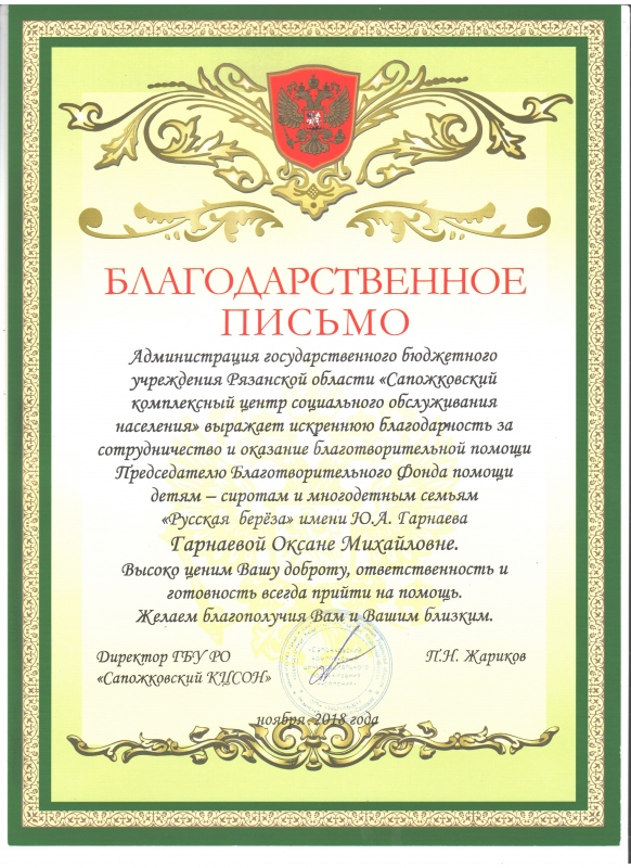 Администрация государственного бюджетного учреждения Рязанской области "Сапожковский комплексный центр социального обслуживания населения" выражает искреннюю благодарность за сотрудничество и оказание благотворительной помощи Председателю Благотворительного Фодна помощи детям - сиротам м многодетным семьям "Русская Береза" имени Ю.А.Гарнаева Гарнаевой Оксане Михайловне. Высоко ценим Вашу доброту, ответственность и готовность всегда прийти на помощь. Желаем благополучие Вам и Вашим близким.