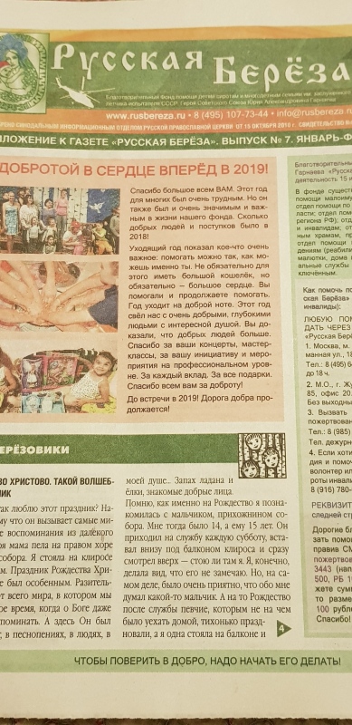 Дорогие наши благодетели! Нам очень нужна помощь в оплате выпуска приложения к газете фонда "Русская Берёза". 14 000 на оплату печати в типографии и 10 000 на оплату верстальщика. Будем рады любой помощи! Приложение помогает людям узнать, куда обратиться за помощью и как помочь. Спасибо большое!