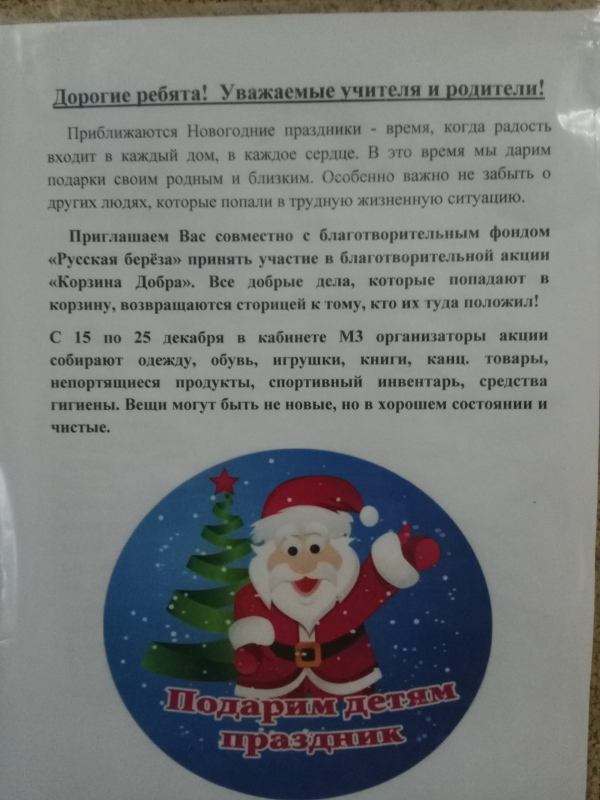 ГБОУ города Москвы «Школа №315» приняли участие в благотворительной акции «Корзина добра». От всей души благодарим директора Соколову Светлану Юрьевну, классного руководителя 5 «Б» класса Липатникову Людмилу Сергеевну, родителей и учеников за то, что подарили частичку своего тепла и заботы подопечным детям фонда «Русская Берёза»! Огромное спасибо вам за помощь! Желаем всем ученикам больших успехов в учебе и оставаться всегда такими же добрыми!