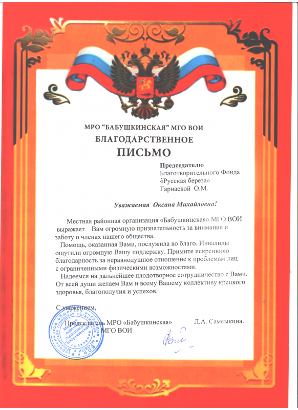 "Местная районная организация «Бабушкинская» МГО ВОИ выражает Вам огромную признательность за внимание и заботу о членах нашего общества.