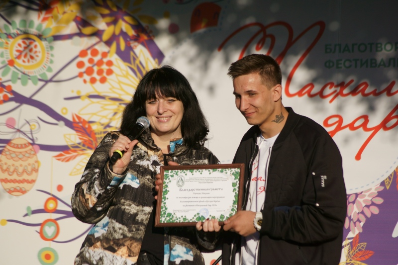 Самый активный волонтер в нашем фонде "Русская Берёза" на Пасхальном Даре был Коля. Он очень много помогал в организации дятельности на двух площадках. Огромный умница и молодец! Спасиб, Коля!