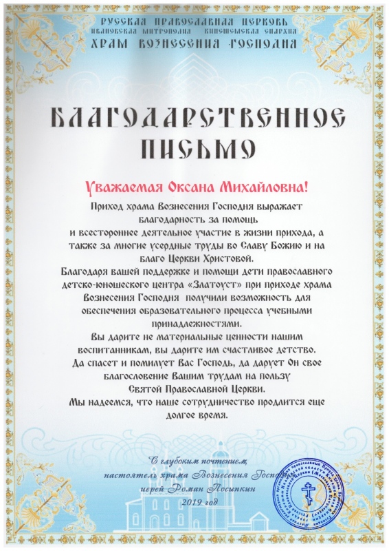 Приход храма Вознесения Господня выражает благодарность за помощь и всестороннее деятельное участие в жизни прихода, а также за многие усердные труды во Славу Божию и на благо Церкви Христовой. Благодаря вашей поддержки и помощи дети православного детско-юношеского центра «Златоуст» при приходе хрома Вознесения Господня получили возможность для обеспечения образовательного процесса учебными принадлежностями. Вы дарите не материальные ценности нашим воспитанникам, вы дарите им счастливое детство. Да спасет и помилует Вас Господь, да дарует он свое благословение Вашим трудам на пользу Святой Православной Церкви. Мы надеемся, что наше сотрудничество продлится еще долгое время.