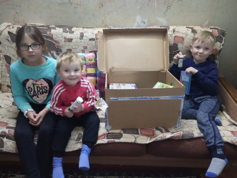 Здравствуйте, уважаемые работники фонда "Русская береза". Получили от фонда посылочку. Спасибо от Саши за подарки, от мальчиков за раскраски. Спасибо за пряжу, канцелярию и вкусняшки к чаю. Желаем вам благополучия и процветания.