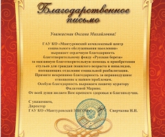 ГАУ КО «Мантуровский комплексный центр социального обслуживания населения» выражает сердечную благодарность благотворительному фонду «Русская Береза» за оказанную благотворительную помощь в приобретении стульев для граждан пожилого возраста и инвалидов, посещающих отделение социальной реабилитации. Примите искреннюю благодарность за неравнодушное отношение к нашим проблемам. Особую благодарность выражаем нашему куратору Филатовой Марине.