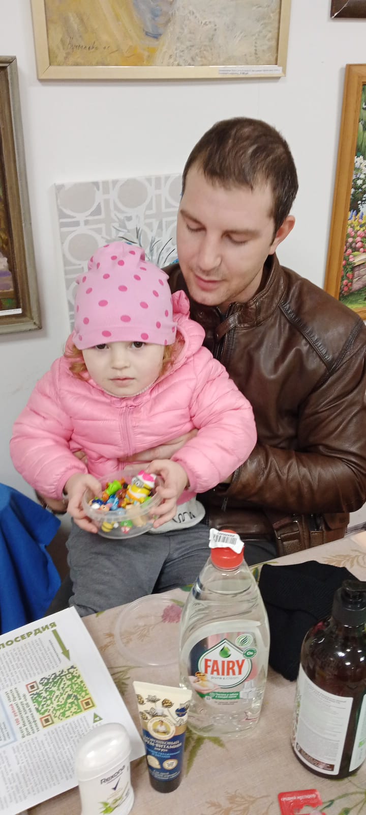 Степан Туровец. Приехали из г.Горловки пос Зайцево. Донецкая обл. Вынужден был вывести супругу с детьми . Доченьке Софье - 2г 9м. Малышу Ивану 10 месяцев. Зашли узнать могут ли им оказать помощь, не записывались. Но, благодаря Кириллу и для них кое-что нашлось.