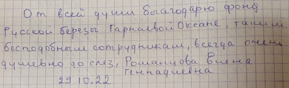 А вот и помощь для Елены из Рубежного. Леночка, как и многие во время обстрелов, сидела в подвале. Дом был изувечен, натерпелась страха и бед. Бежалиа под разрывами снарядов. И вот, несмотря на то, что столько натерпелась, осталась дружелюбным и добрым человеком. Мы в благотворительной галерее фонда "Русская Берёза" полюбили Леночку всем сердцем и она рада, что нашла именно нас. Мы вообще не знаем, как все беженцы всё это время фонд находят, им везде, куда они не обращаются, дают телефон фонда, зная, какая здесь большая помощь и душевное участие. Сами не думали, что так получится. Тяжелое время, денег нет и просто чудеса происходят на глазах!!!!