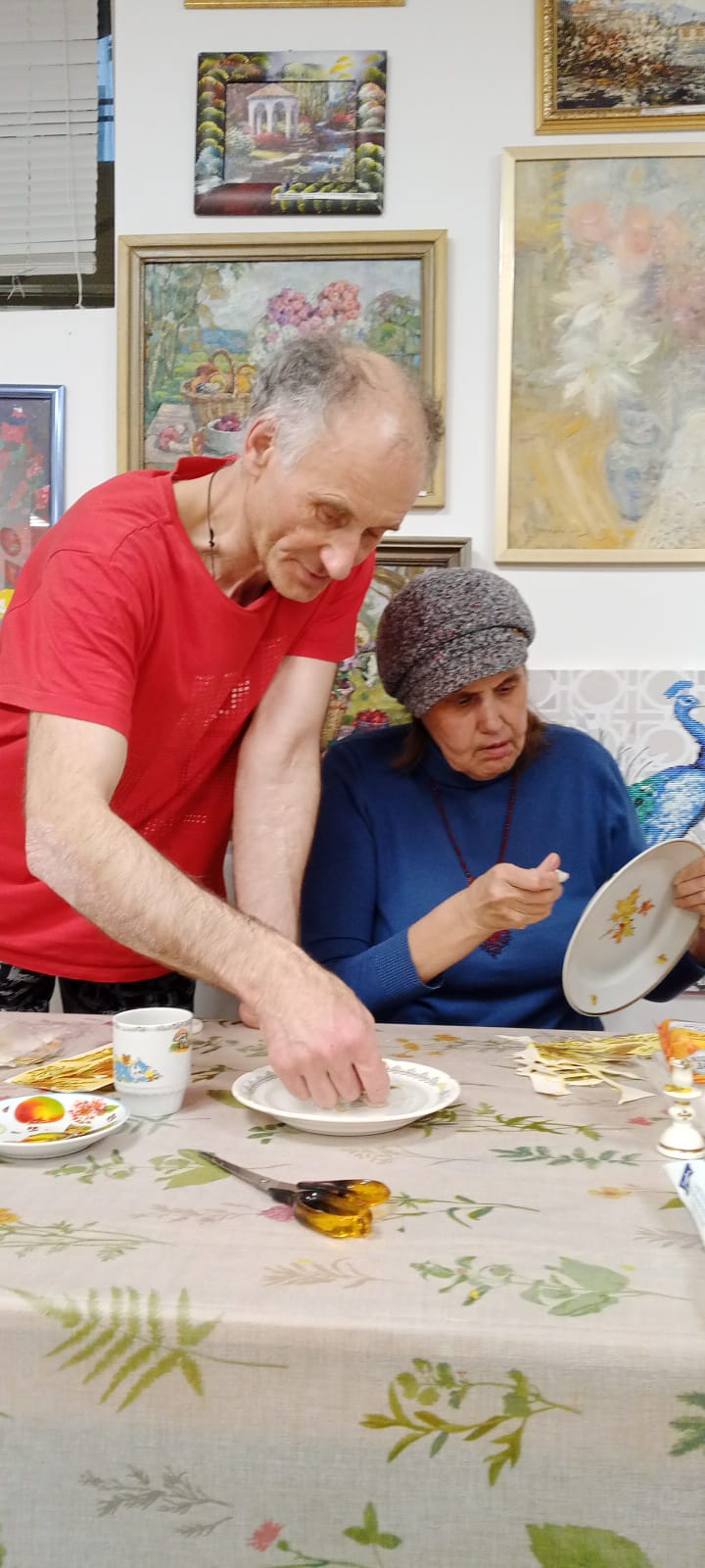 И очень ждут новых мастер классов. Виктор бы и сам с радостью давал больше мастер классов. Только ведь он все материалы, тарелочки, чашечки покупает на свои деньги. Он подопечный нашего фонда. Инвалид. И никогда, ни разу ничего не попросил. Чтоб картиночки помогли купить или тарелочки. Сам же после мастер классов всё обжигает. И потом еще отдает благотворительной галерее, чтобы помочь фонду. Это настоящая благородная святая простота. О таких людях должны знать. Что они жетвуют последним, лишь бы помочь ближним. Спасибо, Виктор!
