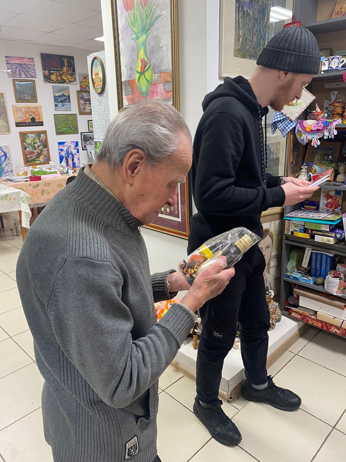 Это наш милый Анатолий Михайлович. Как солнце в нашей благотворительной галерее. Снег - не снег, дождь - не дождь. Много лет ходит к нам и жертвует с пенсии по 5000 рублей. Раньше то с супружницей приходил. Но она уже не выходит... А он всегда. Не оставляет нас, делает добро.