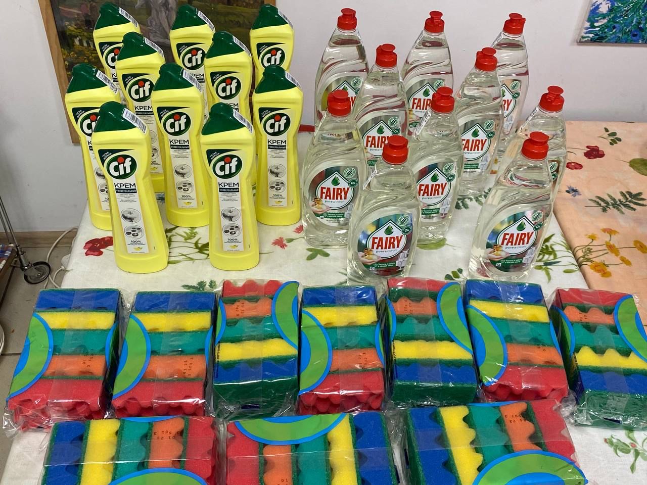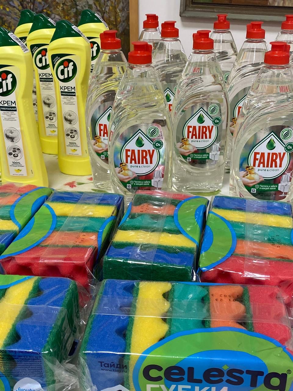 Наши постоянные благотворители знают, что больше всего требуется. Поэтому привезли в Отдел помощи на Бауманской такие важные средства бытовой химии- косметические средства, для посуды, для гигиены.