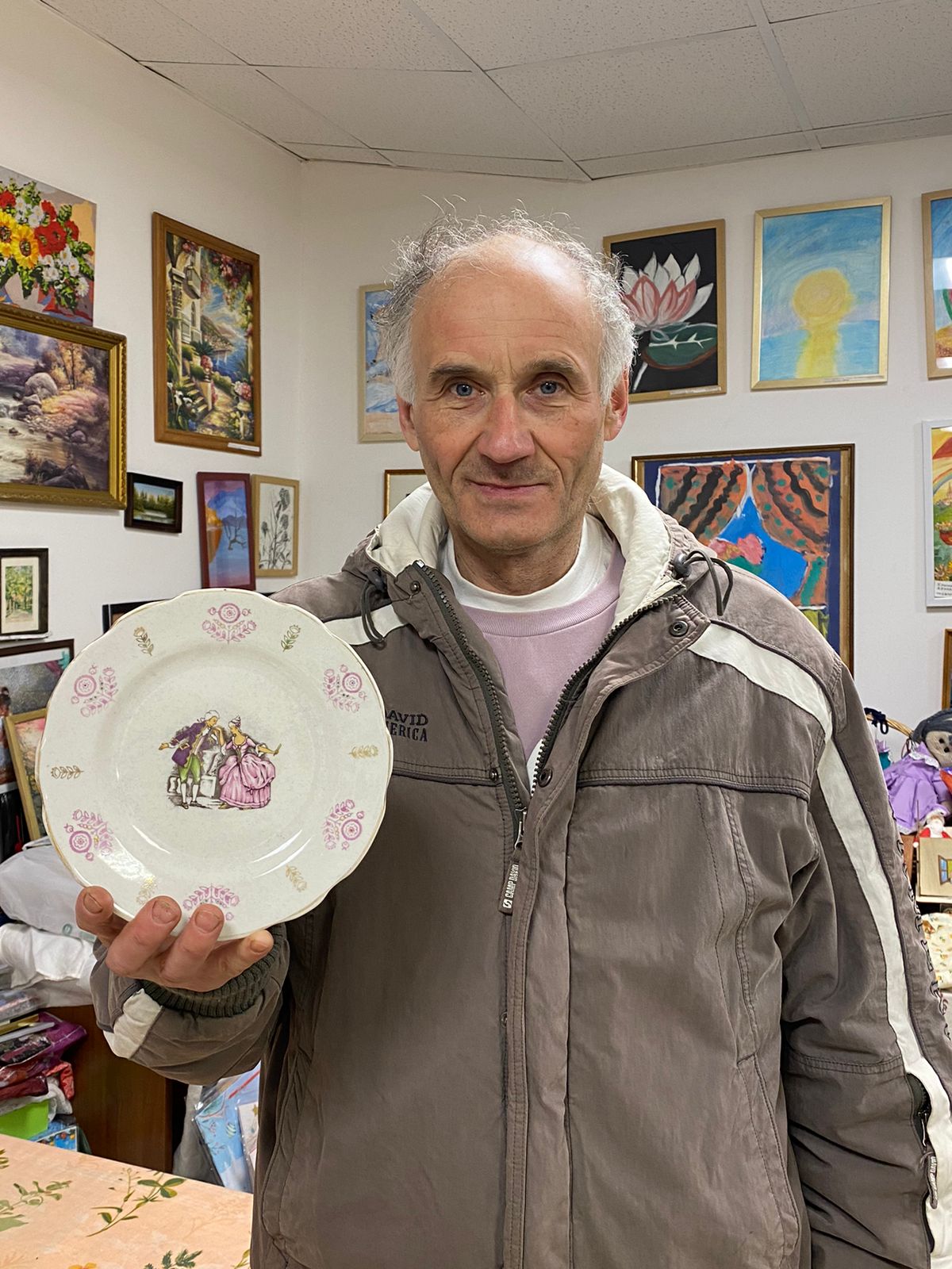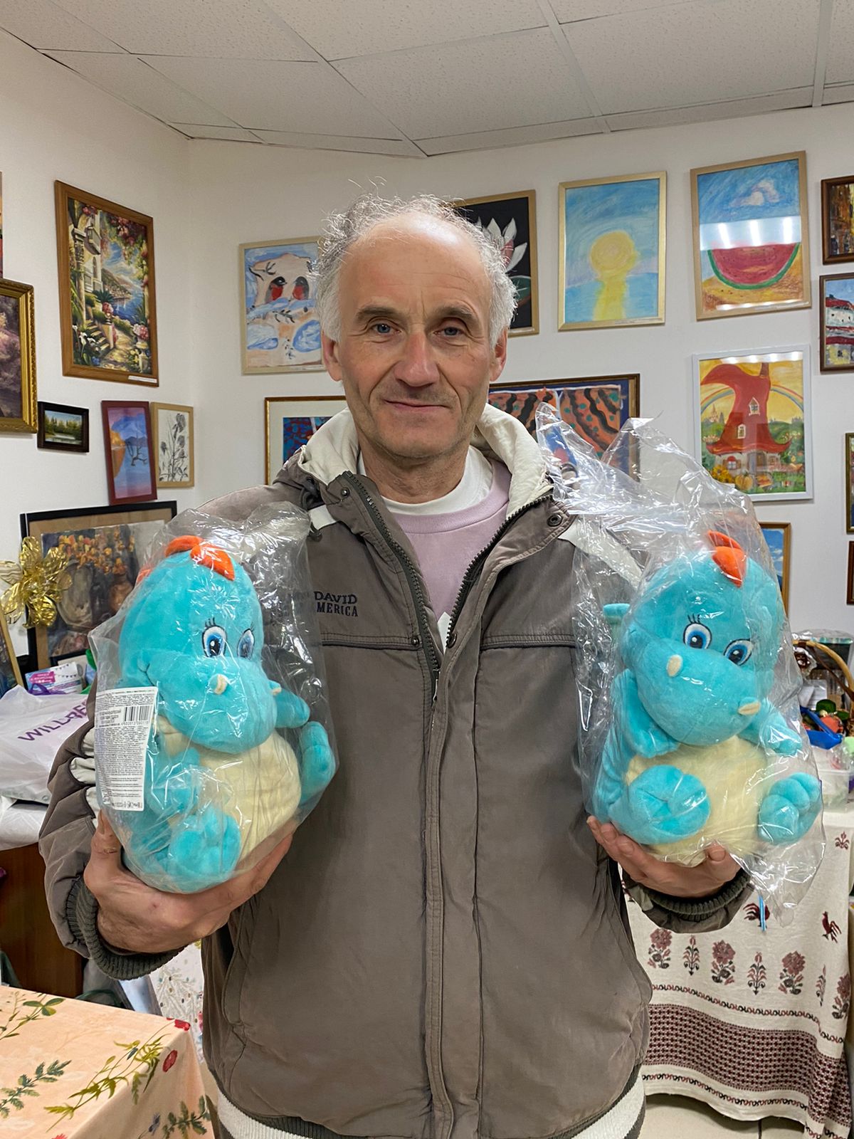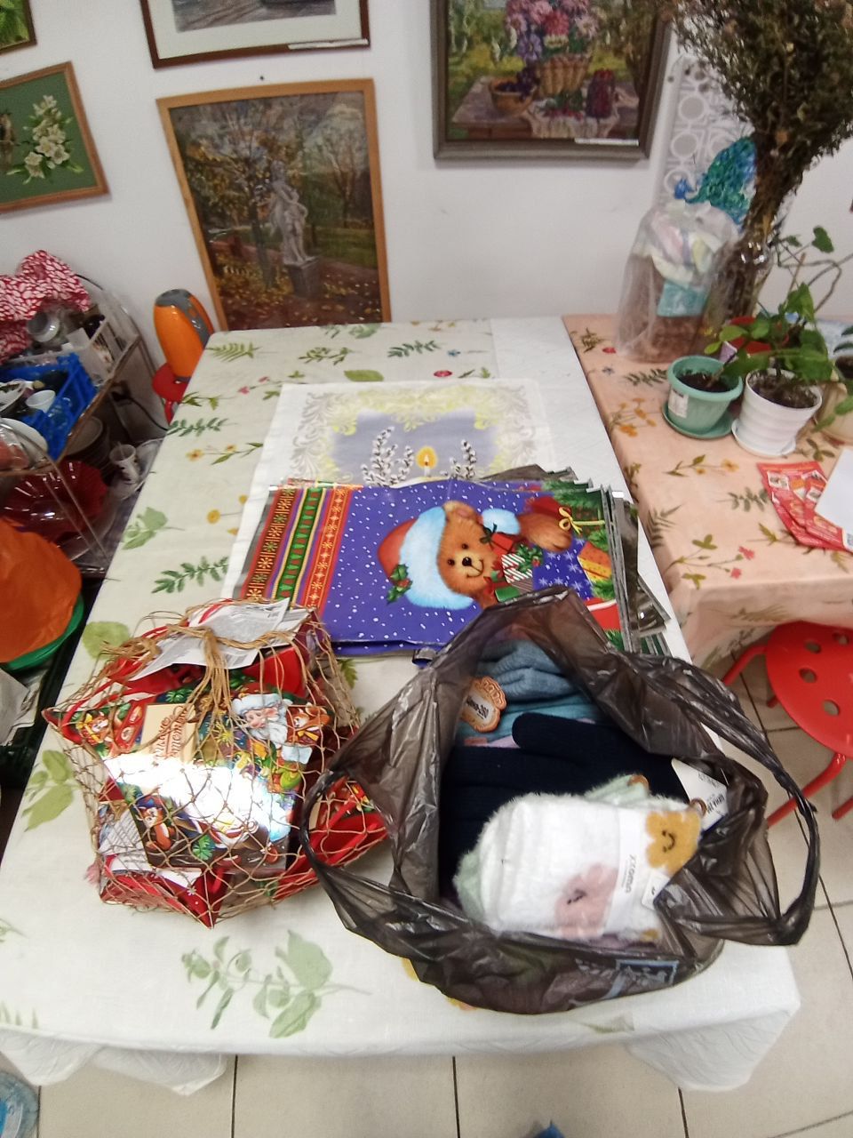 На одной из фотографий шикарные подарки, которые передали Наталья и Дмитрий. А вот уже на другой - наш подопечный Виктор, которому мы передали подарки, он в ответ принес тарелочку для обжига для подопечной Ниночки. Остальные подарки тоже "разлетелись" среди тех, кто обращается в Отдел помощи.