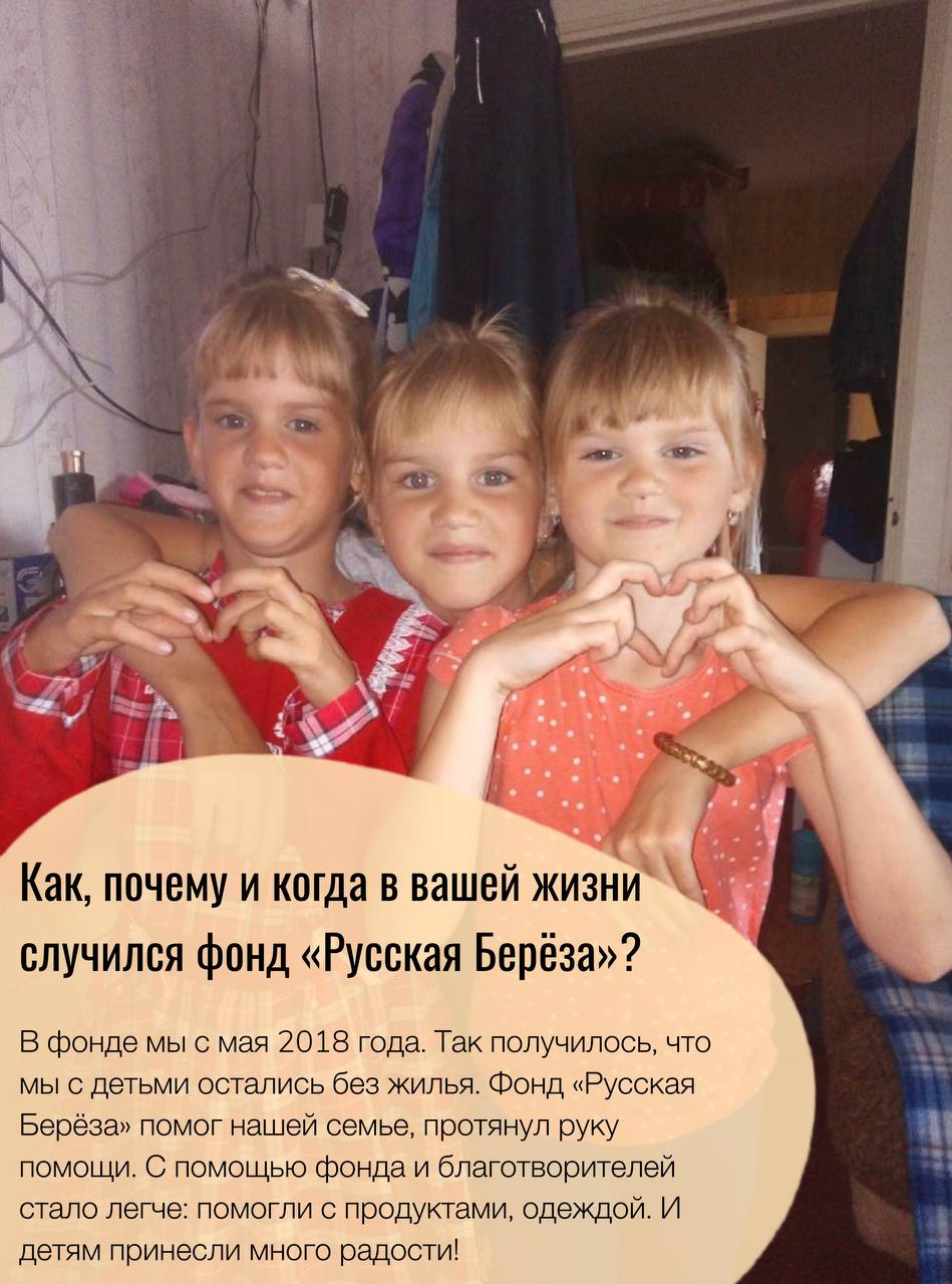 Подопечная из региона (Омская обл.), мама 5-и деток. Это большой стресс - столкнуться с трудной ситуацией, будучи родителем. Ты несёшь ответственность не только за себя, но и за ребёнка. Именно поэтому помощь многодетным семьям - одно из приоритетных направлений работы фонда.
