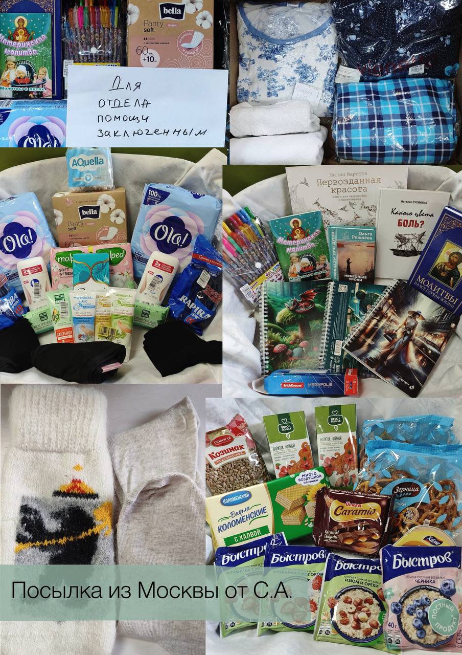 На фотографиях вы видите посылки, собранные нашими благотворителями для отдела помощи заключенным. Мы искренне благодарны всем, кто поддерживает этот важный для нас проект. Отдел помощи заключённым всегда нуждается в: • резиновых и бумажных конвертах • коробках для отправки посылок • наполнении для посылок (см. фотографии) Но самое главное- это оплата отправки посылок. Наши сотрудники ежедневно отправляют их подопечным в регионы, в том числе и заключённым. Наши посылки часто являются единственной поддержкой для заключённых, помогая им хотя бы на какое-то время избавиться от дискомфорта в быту, и давая почувствовать, что они не одиноки!