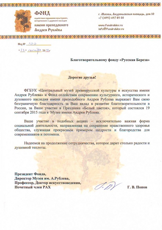 У фонда "Русская Берёза" бывает очень много прекрасных добрых мероприятий. Например, ещё в сентябре, фонд принял участие в благотворительном празднике "Белый Цветок", который состоялся в Музее Андрея Рублёва. Праздник был посвящён 120-летию со дня рождения Великой Княжны Ольги Николевны Романовой, 655- летию со дня рождения св прп Андрея Рублева и 55-летию со дня открытия музея.