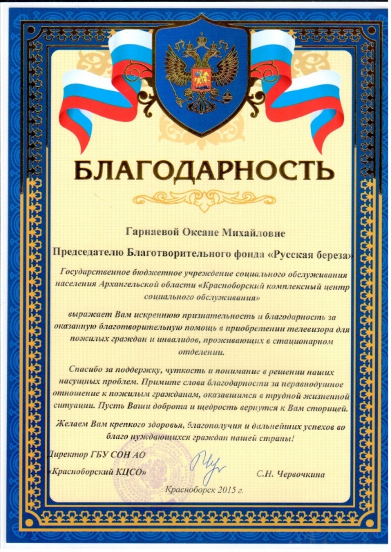 В ноябре фонд "Русская Берёза" купил телевизор за 46 325 рублей бабулькам и дедулькам из Дома Престарелых Архангельской Области. (Правильное название: "ГБУСОН Архангельской Области "Красноборский комплексный центр социального обслуживания"). Телевизор приехал к старичкам! Ура! Теперь Новый Год бабульки и дедульки встретят под поздравление Президента и бой курантов!