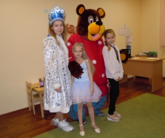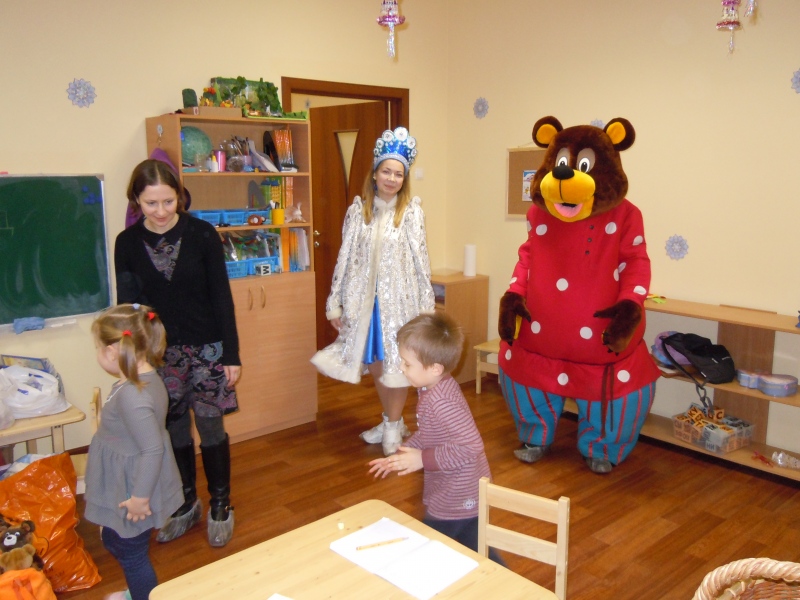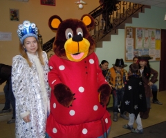 Приехали - и сразу попали на праздник. В этот день в школе роста был новогодний праздник - по лестницам бегали зебры и пантеры, маленькие феи, ковбои и пираты. Познакомиться с Мишкой и Снегурочкой вышла директор школы Казанцева Наталья Юрьевна, чудесным образом перевоплотившаяся в веселую Бабу-ягу. Обнялась с Мишкой и Снегурочкой и предложила дружить дальше!