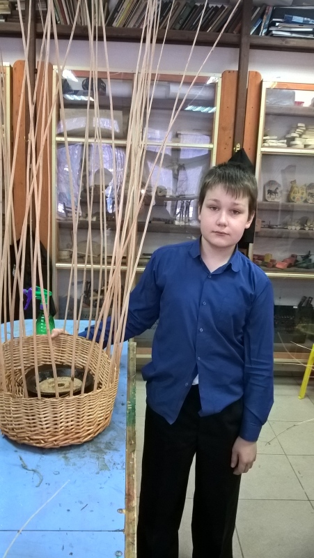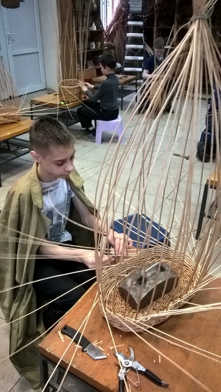Прут есть – дело за мастерами. Ребята учатся этому ремеслу с 5 класса. Дремлет талант в каждом мальчишке – нужен только повод. И вот уже готовы каркасы доньев, которые кружатся в руках маленьких мастеров, превращаясь в плетёные основы. Остро заточенные стоячки закрепляются в них. Борт корзины, как борт корабля, должен держать удары, быть ровным, крепким и надежным – не эти ли качества делают из мальчиков мужчин?