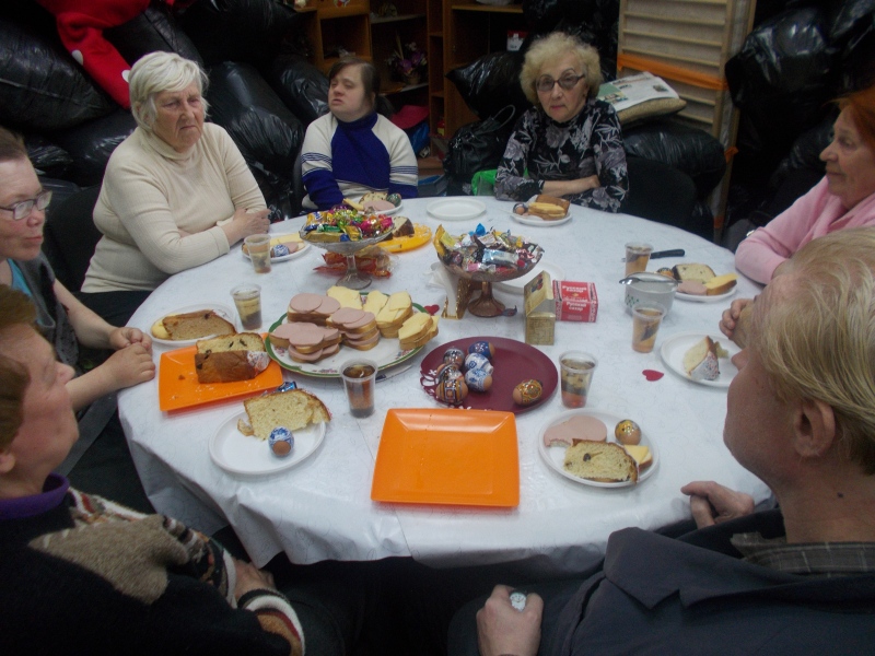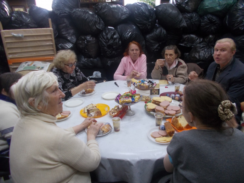 У нас (в фонде "Русская Берёза", отдел помощи) сохранилось несколько фотографий, сделанных во время пасхального чаепития для трапезников. Сидят наши трапезники кушают, радуются, а вокруг них стены из мешков гуманитарной помощи. Собиралась эта помощь, как уже мы писали ранее, в Нефтекамск. Готовили отправку долго и тщательно. И столкнулись с большой проблемой - нам негде хранить собираемую гуманитарную помощь. Нет, теоретически, конечно же, есть. Но тогда получаются вот такие станы из мешков. А еще не сфотографировали коробки и крупные вещи, такие как кроватки и коляски.