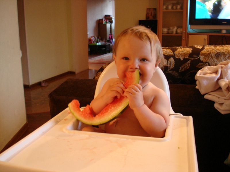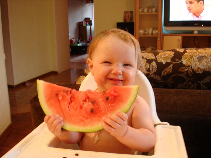 Лето – замечательное время года. Это пора теплой погоды, спелых овощей, фруктов и ягод! В конце июля Любочка первый раз попробовала вкусный арбуз! С каким удовольствием она его кушала видно на фотографиях! Любочка осталась очень довольна таким вкусным полдником!