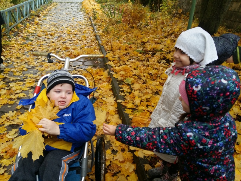 С праздником Покрова Пресвятой Богородицы! Я не удержалась, чтоб не продолжить тему о Сёмочке. Сегодня мы с детьми взяли его с собой на службу. Мои дети такого ребёнка видели впервые. И меня очень обрадовало то, что они к нему очень тепло отнеслись, не оттолкнули, даже намека не было на то, что он какой-то другой, особенный. У нас было много времени, чтобы пообщаться, так как мы думали, что будет только Литургия, а, когда пришли в храм, оказалось, что шла Утреня. Чтоб не беспокоить других верующих, мы с детьми пошли гулять вокруг храма. Пока мы гуляли, Сёмочка со всеми перезнакомился. Несмотря на то, что он очень плохо произносит слова, дети его понимали. Они его катали на коляске, собирали листочки, о чем-то спрашивали, а он что-то отвечал. Рома, который дома со всеми скандалит, вообще не отходил от Сёмочки. Сёма обнимался и целовался с детьми. Но я заметила, что так он относится далеко не ко всем. Некоторых он, наоборот, сторонился и начинал плакать. Понимает абсолютно всё. Если не понимают его, он тоже плачет. И тогда нужно спрашивать, что он хочет: кушать, пить, кататься и т.д. Сёмочка отвечает "да" или "нет". Новые слова сразу повторяет. Мы с ним делали селфи и чтоб сфотографировать, я говорила телефончику: "Снять!", Сёмочка за мной повторял: "Бать!". Няня Галя, которую нанял другой фонд ухаживать за Сёмочкой, сказала, что он сам кушает ложкой. Я ему давала в храме бумажку с ручкой, он старался что-то написать. В храме он показывал, где нарисован Бог и ангелы. Меня он смешно называл "Тотя")))). В общем, так жалко, что он сирота. Мне кажется, его ещё очень можно развить, тем более, ему будет намного легче, если после операции он начнет ходить. Пока он может только стоять на своих извернутых ножках. Они у него вообще вывернуты внутрь.