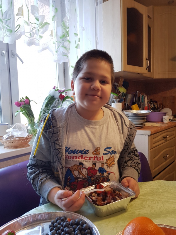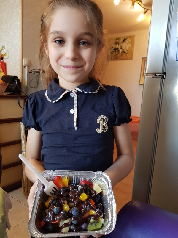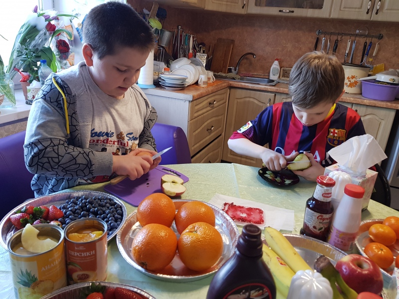 Забабахали тут с детишами праздничный фруктовый салатик. Решили вместо тортов, чтоб полезное, не толстящее. Давно обещала лично устроить десерт от шеф - повара))) Вначале с Ромой еле дотащили сумки с фруктами и топпингами. Представляете, сколько на нашу семью нужно всего! Если бы парни не помогли мне почистить фрукты, я б и не знаю, как справилась. Каждый выбрал себе свой наполнитель, экспериментировали, обсуждали. Крошка какао не понравилась никому, её сразу убрали для дальнейших тортов, на которые я когда-нибудь сподвигнусь. На самом деле я обожаю готовить. И очень страдаю от того, что у меня нет на это времени и готовит у нас повар. Так что получается только побаловаться эпизодичными творениями. Хотя, нас это очень объединяет. Даже Плюша не отходила)) Вот закончится Пост, возьму выходной и сварю свои коронные щи - борщи со шкварками))))