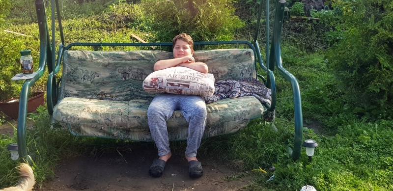 Когда мы только приехали в начале лета в деревню, Ромик весь изнылся и сказал, что не хочет в деревне справлять свой день рождения, а хочет в городе со своими друзьями. В тот момент до дня рождения оставалось 2 месяца))) За два месяца неразлучного проживания вместе, Ромик о городе уже забыл)))) Ранним утром 21 августа, проснувшись раньше всех, он уже сидел на качельках и ждал свой день)))
