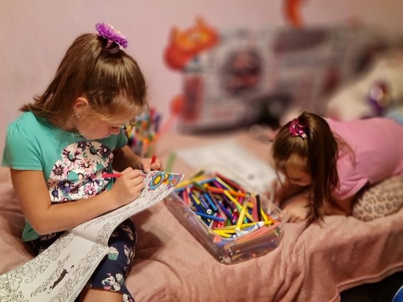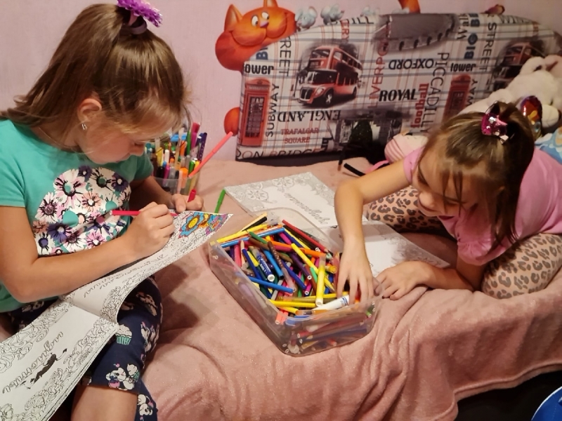 Из Дусиного Инстаграма @evdokiyagarnaeva Когда у нас с Кариной стресс, мы разукрашиваем картинки-антистресс @ Zhukovskiy, Moskovskaya Oblast', Russia